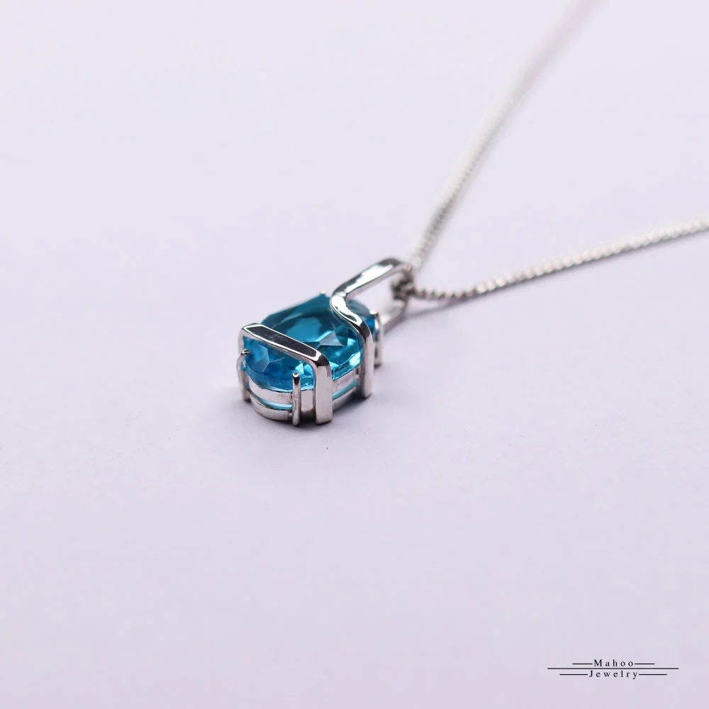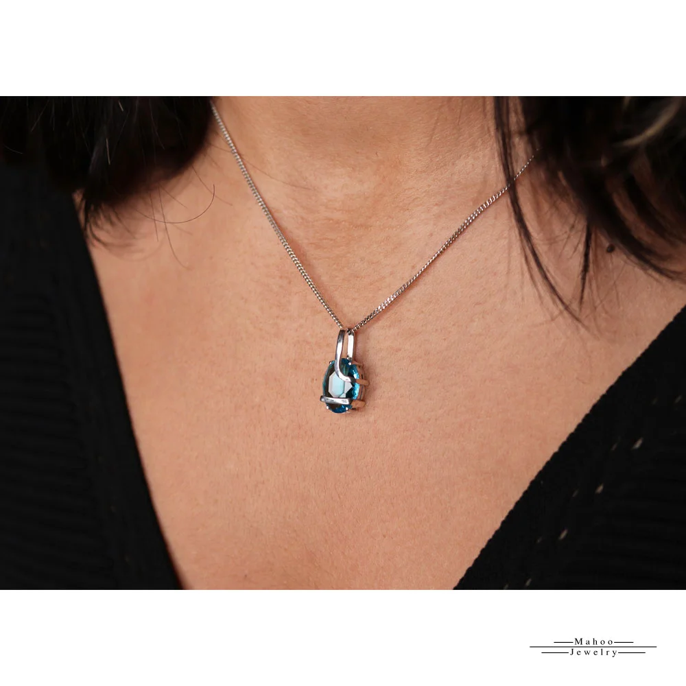 یک نگین بزرگ رنگ آبی آسمانی (آکوامارین سنتتیک) تراش بیضی سایز 10 در 19 میلیمتر داره که زیبایی بی نظیری به این گردنبند داده.